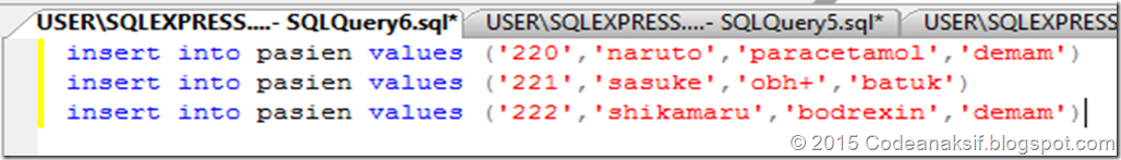 5. Setelah table selesai dibuat sekarang kita isi table tersebut, caranya klik kanan pada rumahsakit2 lalu pilih new query lalu ketikkan perintah seperti dibawah: